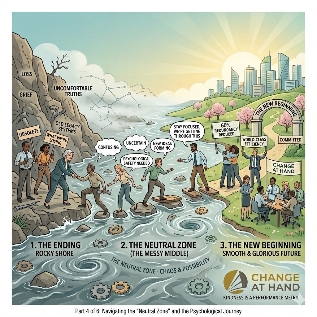 1. The Ending (The Hard Part): Every change begins with a loss or a step away from what’s familiar, even if it feels rough. Kindness means recognizing what people are leaving behind, like their skills with an old system or a comfortable routine. You can’t reach the best outcome without respecting the hard goodbye to that certainty.